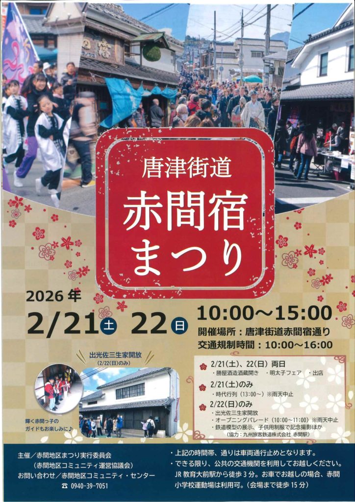 ●唐津街道赤間宿まつり開催 お知らせ 2026.01.27 ◆両日開催・・・出店、明太子フェア、酒蔵開き ◆2月21日(土)のみ・・・時代行列 ◆2月22日(日)のみ・・・オープニングパレード、出光佐三生家の特別公開、鉄道模型の展示など ご家族で1日楽しめるイベントです。ぜひお越しください。