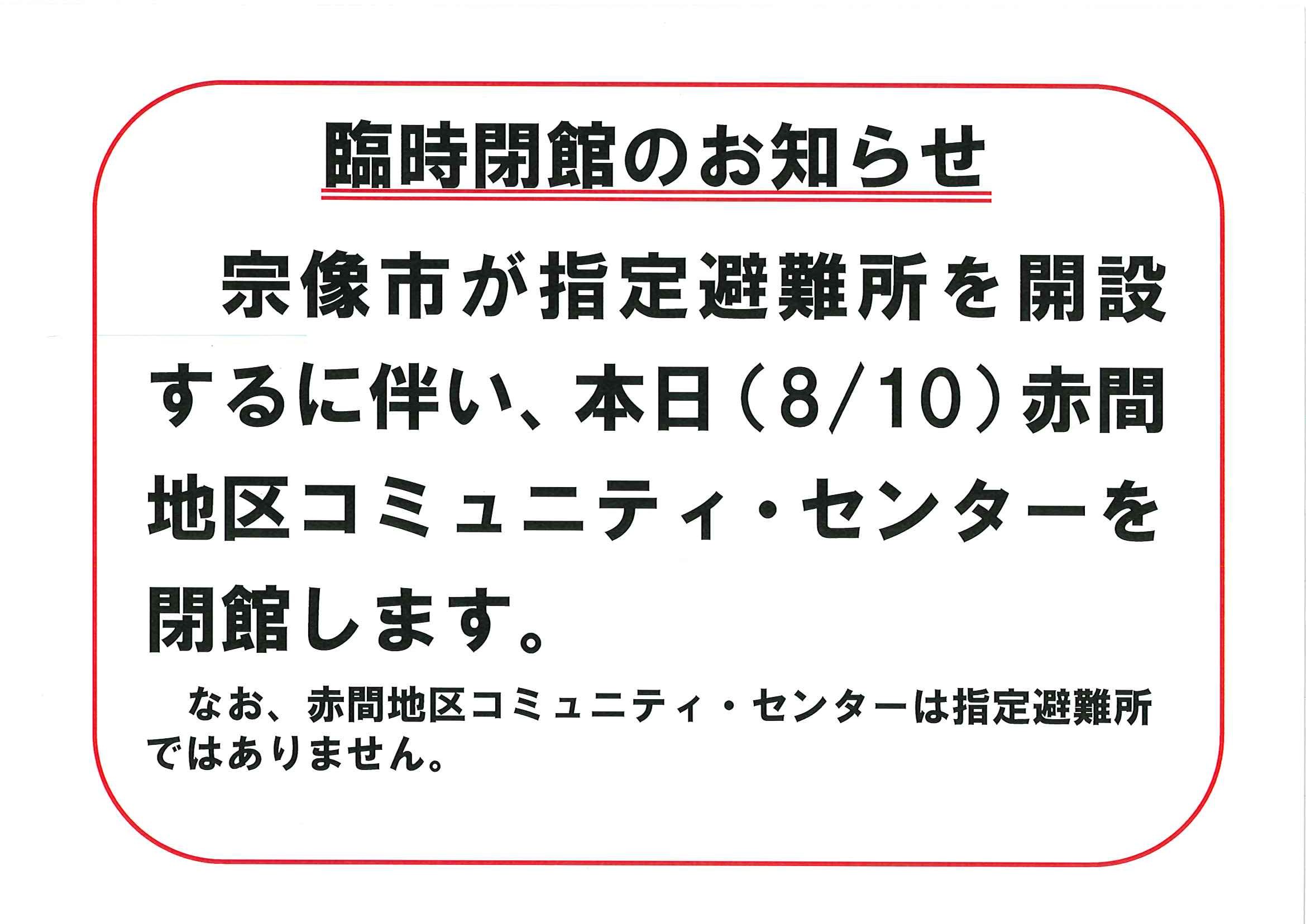 ●臨時閉館のお知らせ(8/10) お知らせ 2025.08.102025.08.12 宗像市が指定避難所を開設するに伴い、本日(8/10)赤間地区コミュニティ・センターを閉館します。 なお、赤間地区コミュニティ・センターは指定避難所ではありません。