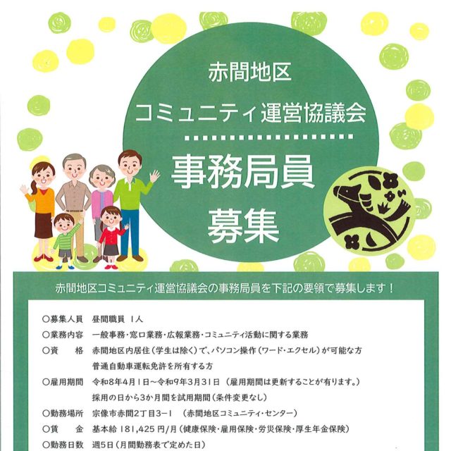 赤間地区コミュニティ運営協議会の事務局員を募集します。